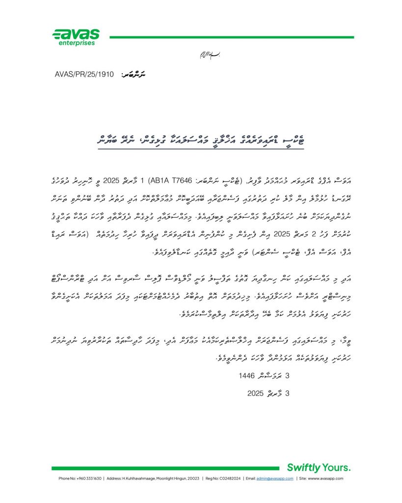 އަދި މި މައްސަލައިގައި ކަން ހިނގާދިޔަ ގޮތުގެ ތަފްސީލް ވަނީ ފުލުހުންނާއި ޓްރާންސްޕޯޓް މިނިސްޓްރީއަށް ހުށަހަޅާފައި ކަމަށް ވެސް އަވަސް އިން ބުނެއެވެ.