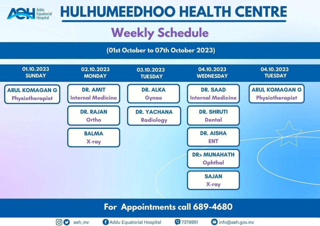 މަރުކަޒުގެ ވީކްލީ ޝެޑިއުލް އަށް ބަލައި ލިޔަސް ކުރިން އަންނަ ވަރަށް ޑޮކްޓަރުން ނާންނަކަން ފާހަނގަ ކުރެވޭނެއެވެ.