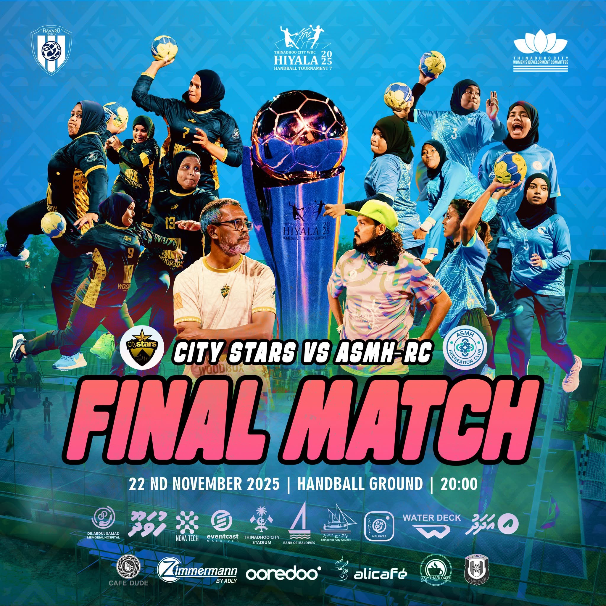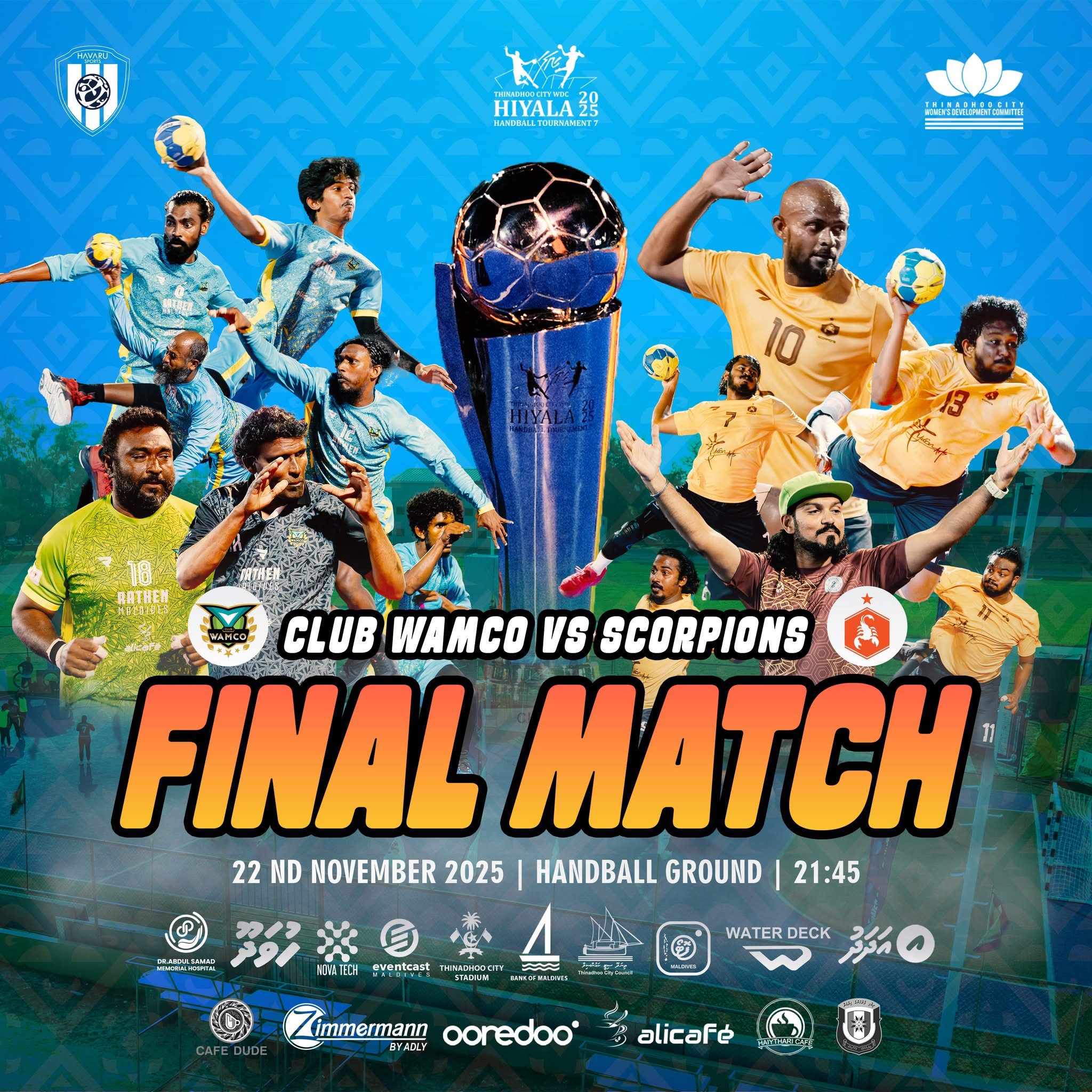 ތިނަދޫގެ ހޭންޑްބޯލް ގްރައުންޑުގައި ފައިނަލް ކުޅޭނީ މި އިވެންޓުގެ ކާމިޔާބީއަށް ޙިއްޞާކުރާ ލޯކަލް ސްޕޮންސަރުންނާއި ޕާޓްނަރުންގެ ދިގު ލިސްޓެއްގެ އެހީތެރިކަމާއެކުގައެވެ. ބެކް ޓު ބެކް މެޗުތަކާއެކު ސަޕޯޓަރުން ކެތްމަދުވެފައި ތިބީ ފުރިހަމަ ރެއަކަށް، ހޭންޑްބޯޅައާއި ކޮމިއުނިޓީ ރޫހާއި ޗެމްޕިއަންޝިޕް ފެންވަރުގެ ފޯރިއާއެކުގައެވެ.