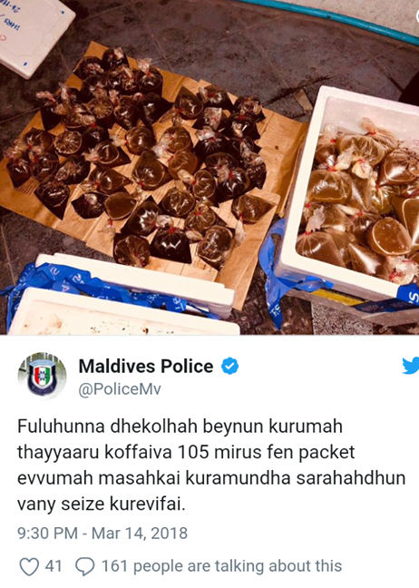 މިކަމާއި ގުޅިގެން ފުލުހުން ކުރެއްވި ޓްވީޓެއްގައި ވިދާޅުވީ، “ފުލުހުންނާއި ދެކޮޅަށް ބޭނުންކުރުމަށް ތައްޔާރުކޮށްފައިވާ 105 މިރުސް ޕެކެޓް އެއްވުމަށް މަސައްކަތްކުރަމުންދާ ސަރަޙައްދުން” ސީޒް ކުރެވިފައިވާ ކަމަށެވެ.