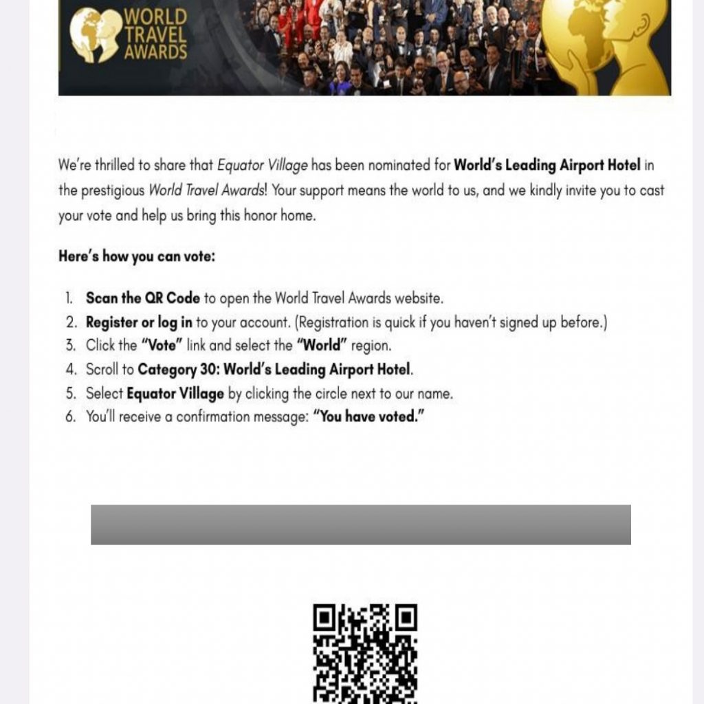 To vote for this award, you can scan the QR code or visit the World Travel Awards website and register an account, then select Equator Village as the World Leading Airport Hotel to participate in the vote.